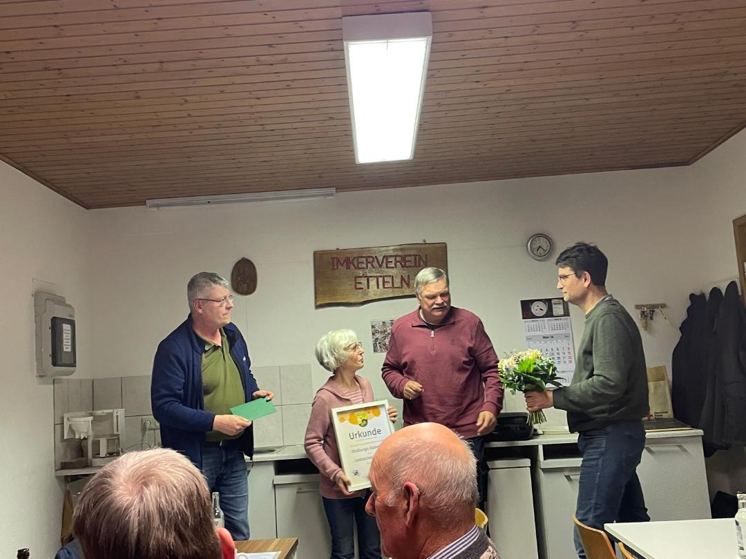 Der neue Vorsitzenden Bernd Schäfers überreicht der alten Vorsitzenden Walburga Kammler die Urkunde zur Ernennung als Ehrenvorsitzende des Vereins.